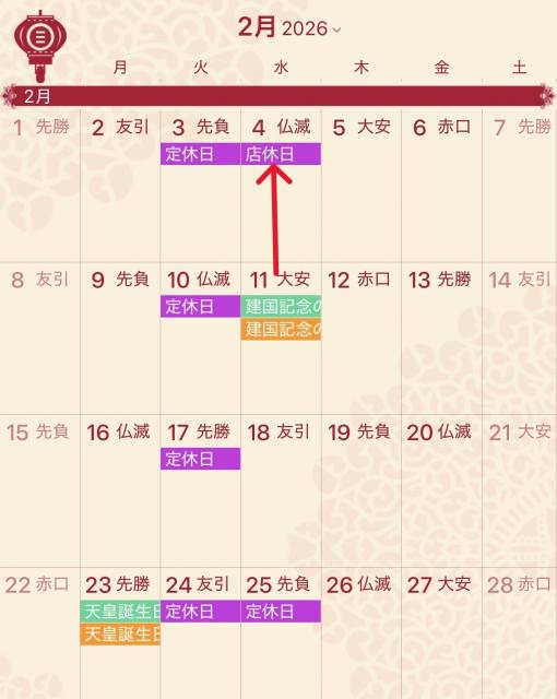 2月は毎週火曜日と第1水曜日と第4水曜日がお休みとなっております。
